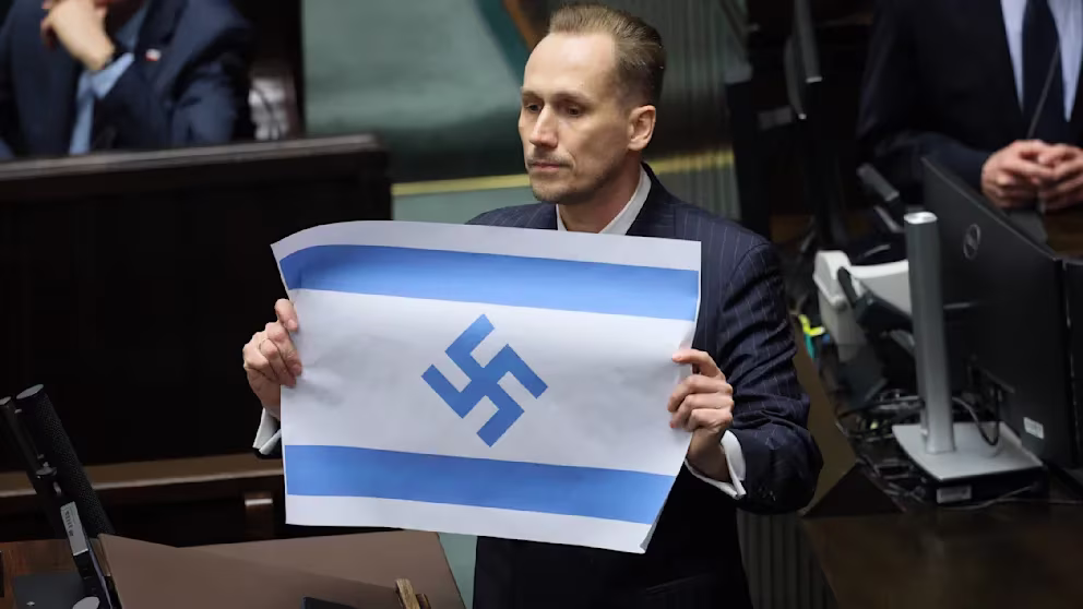 Депутат польского Сейма показал флаг Израиля со свастикой, выступая против геноцида палестинцев