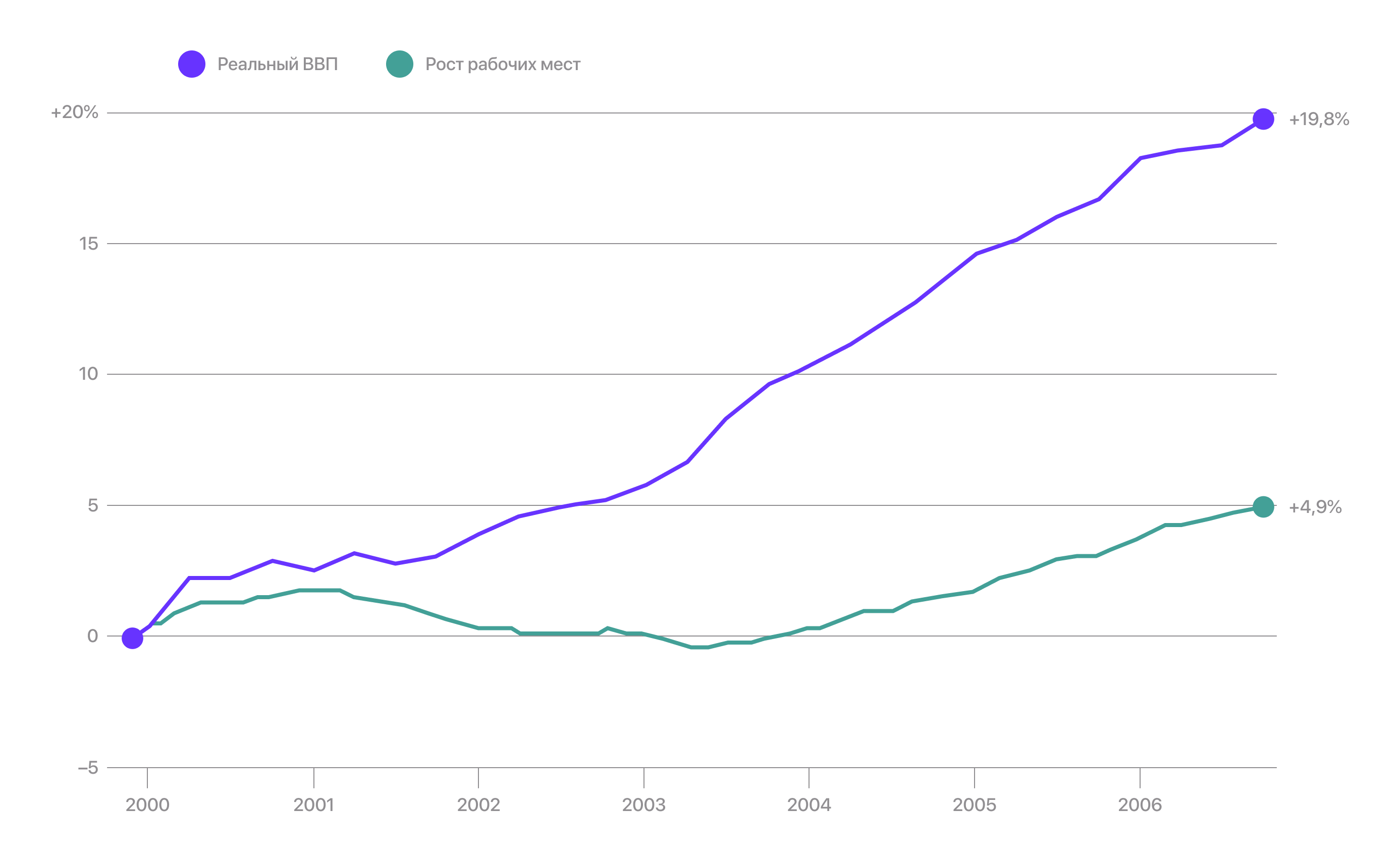 Однако восстановление ВВП не сопровождалось улучшением ситуации на рынке труда. Для работников это обернулось долгим периодом стагнации. В 2001 году было утрачено 1,7 млн рабочих мест, в 2002-м — еще 518 тысяч. Годовой прирост занятости оставался отрицательным вплоть до ноября 2003 года — спустя два года после формального окончания рецессии. К концу 2003-го число занятых в экономике оказалось ниже уровня 1999 года, тогда как объем производства вырос на 10%.