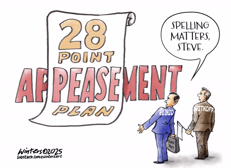 Госсекретарь США Марко Рубио проводит встречу с сенаторами-республиканцами и заявляет, что рассматриваемый документ не является «мирным планом Трампа». При этом подлинность утекшего текста никто публично не ставит под сомнение.