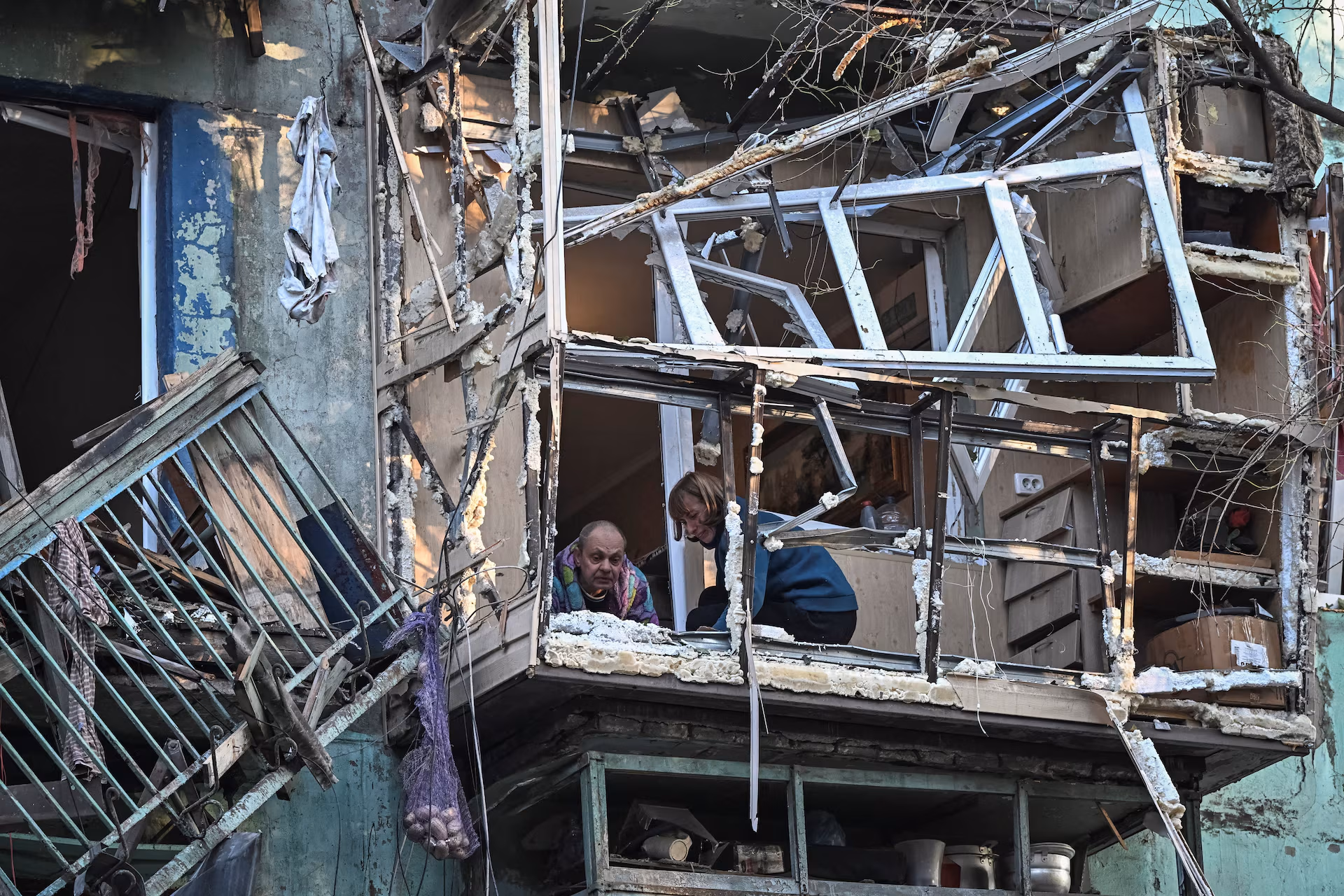 Жители Запорожья убирают балкон своей квартиры в многоэтажном доме, поврежденном российским ударом дрона во время атаки на Украину. 22 октября 2025 года.