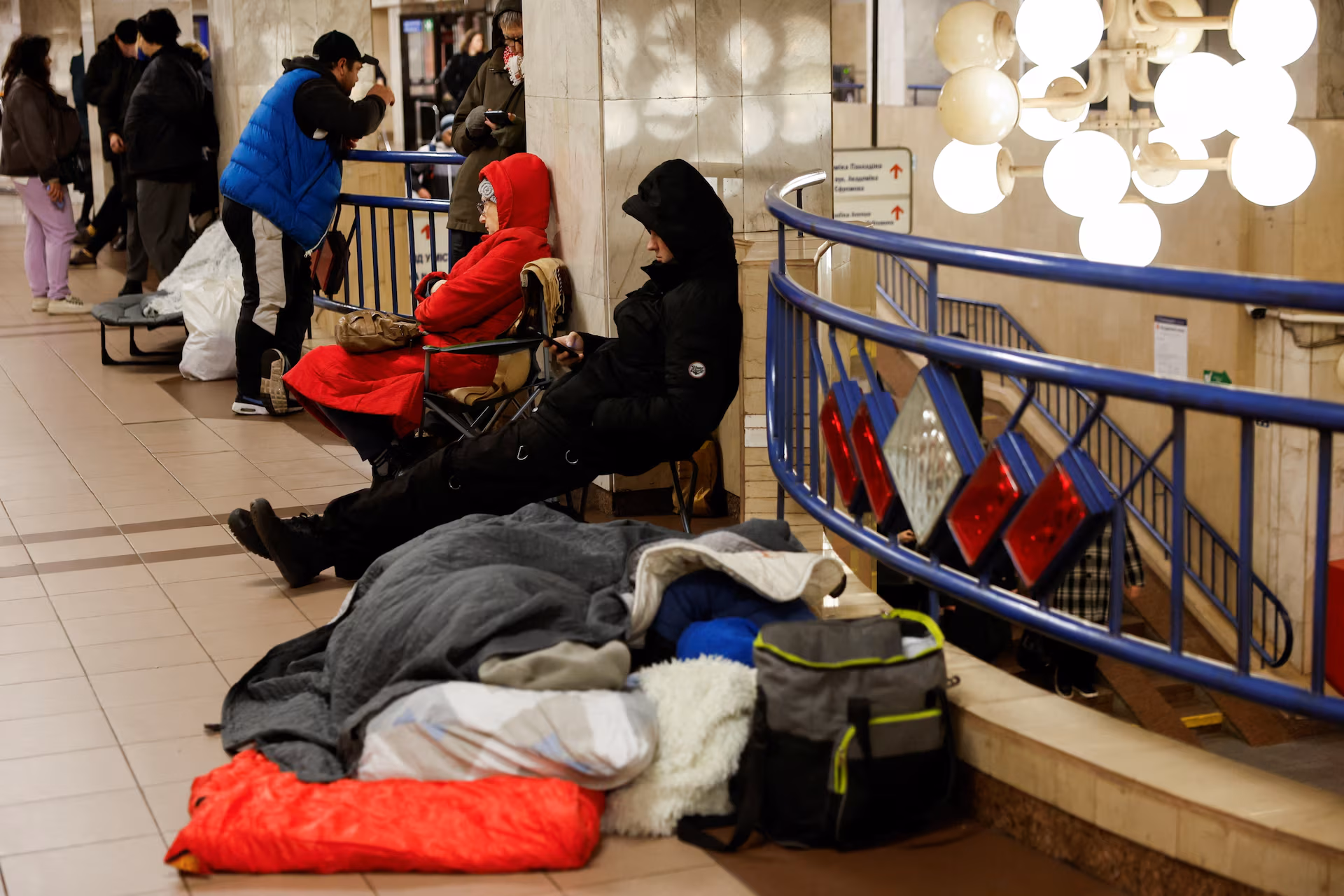 Жители Киева укрываются на станции метро во время российского удара дронами и ракетами по Украине. 22 октября 2025 года.