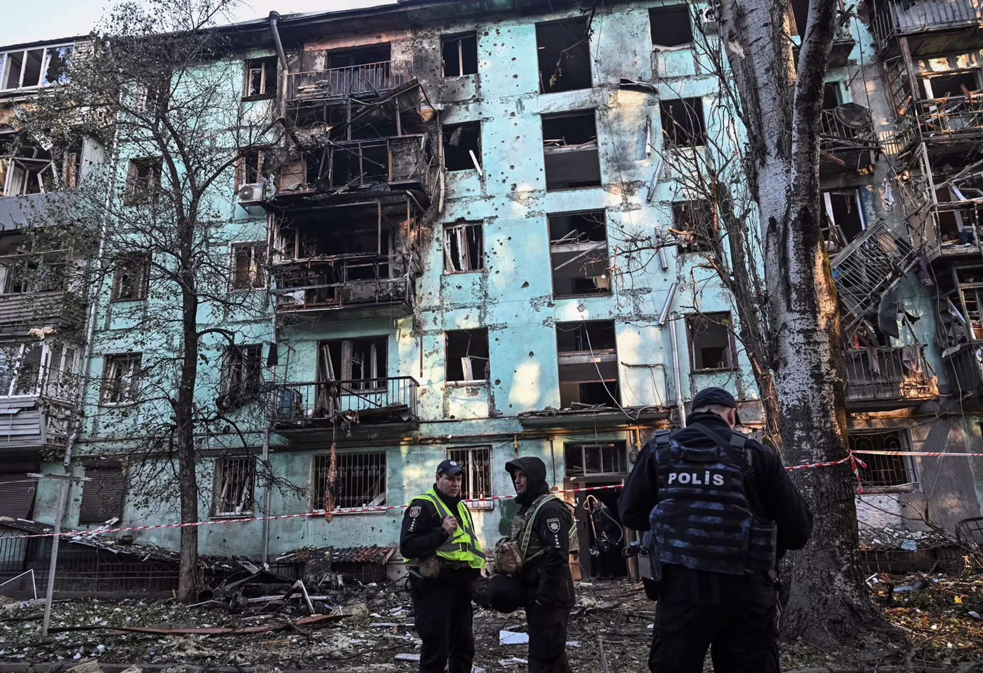 В Киеве люди собираются рядом с жилыми домами, поврежденными в результате российского удара дронами и ракетами во время атаки на Украину. 22 октября 2025 года.