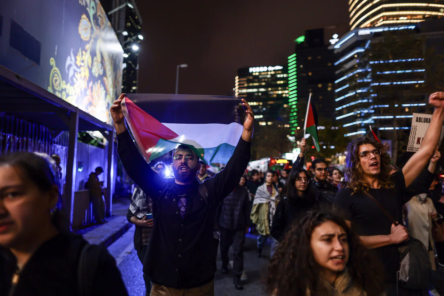 Сторонники Газы проводят акцию у генконсульства Израиля в Стамбуле. 2 октября 2025 года.