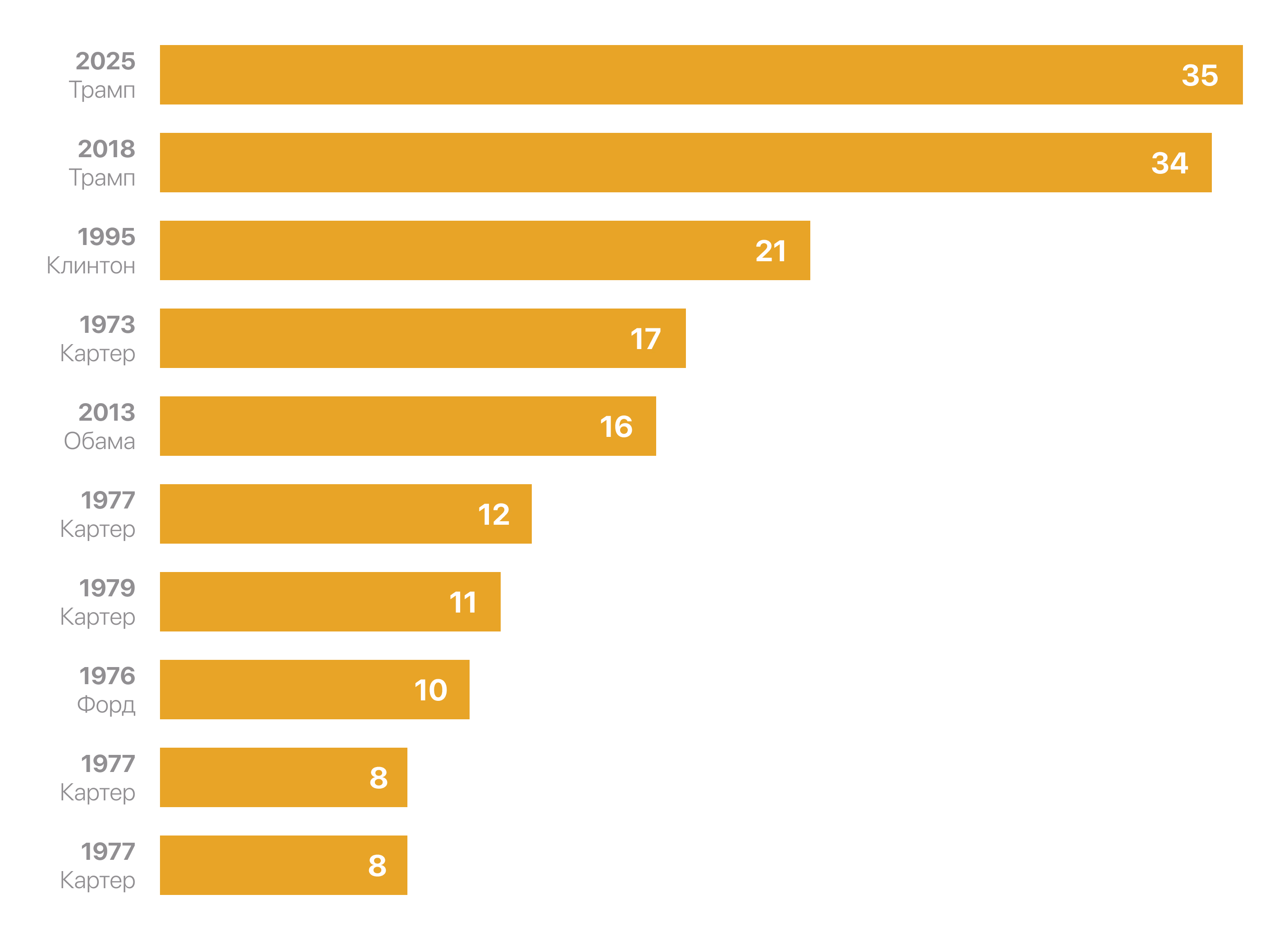 Прошлый месяц стал для Трампа своеобразным «рекордом»: он превзошел Джимми Картера по общему числу дней, проведенных страной без утвержденного бюджета — 56 дней в рамках пяти шатдаунов. При этом Рональд Рейган по-прежнему остается лидером по количеству остановок работы правительства — их было восемь за два президентских срока.