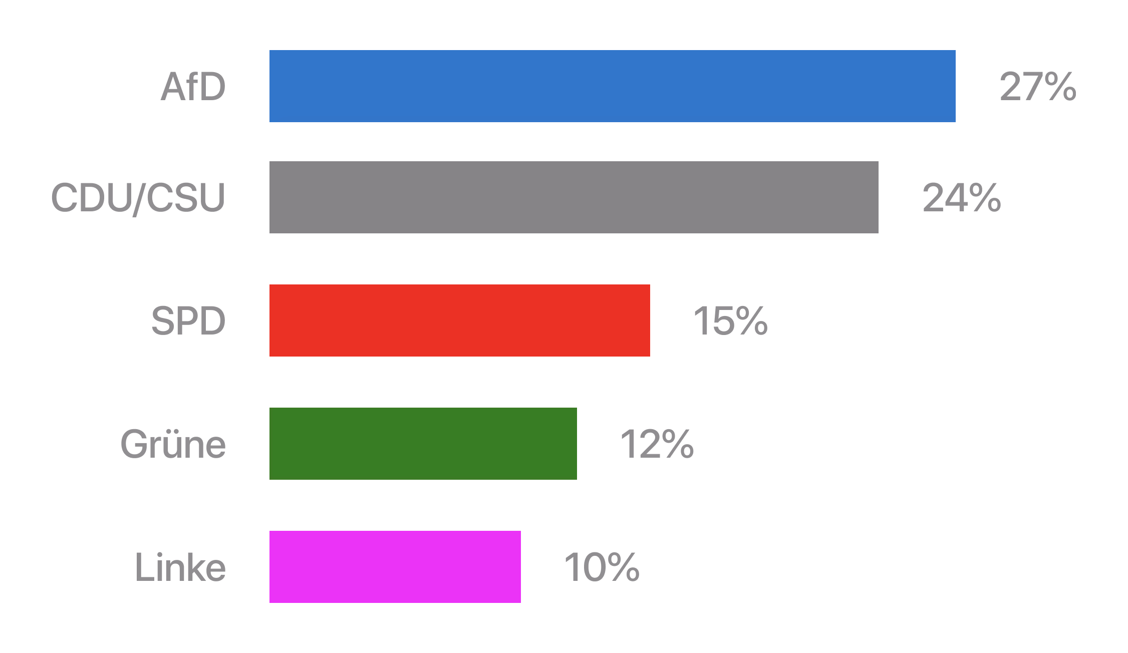 According to the latest poll by the GMS institute, 27% of respondents say they would vote for the Alternative for Germany, while the Christian Democratic Union–Christian Social Union bloc is backed by 24%. For the Alternative for Germany, this represents both the highest level of support recorded in the history of GMS polling and the largest margin ever registered over the CDU/CSU—three percentage points.