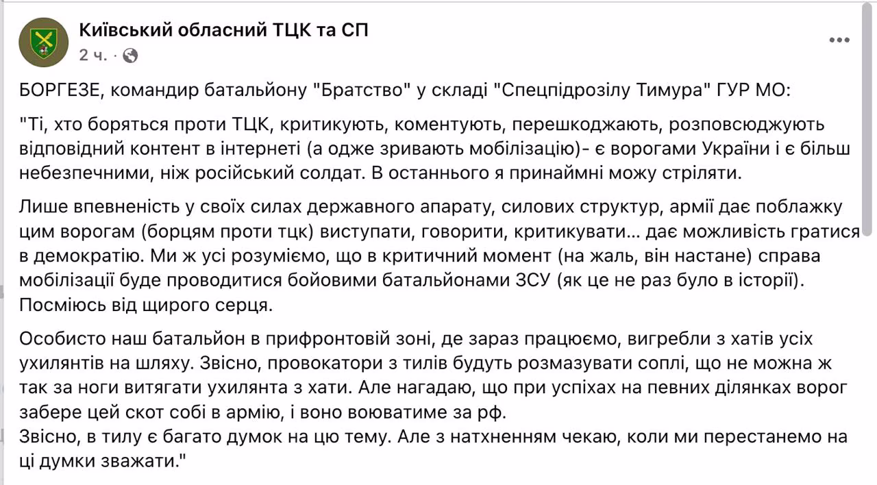 Quote in the screenshot: “Those who oppose the TCC are enemies of Ukraine.”