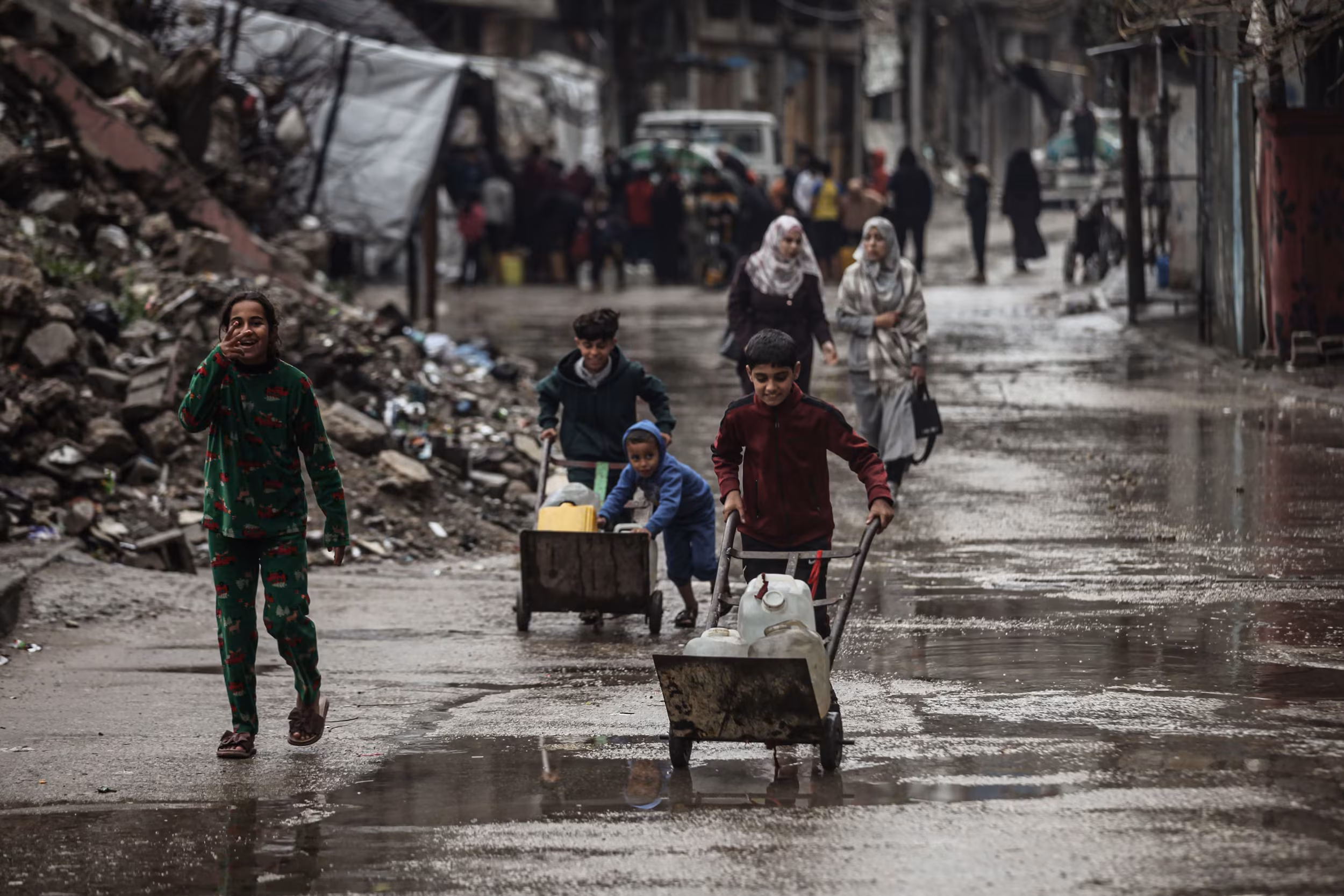 Displaced Palestinians struggle to access drinking water amid rainy weather in Nuseirat.