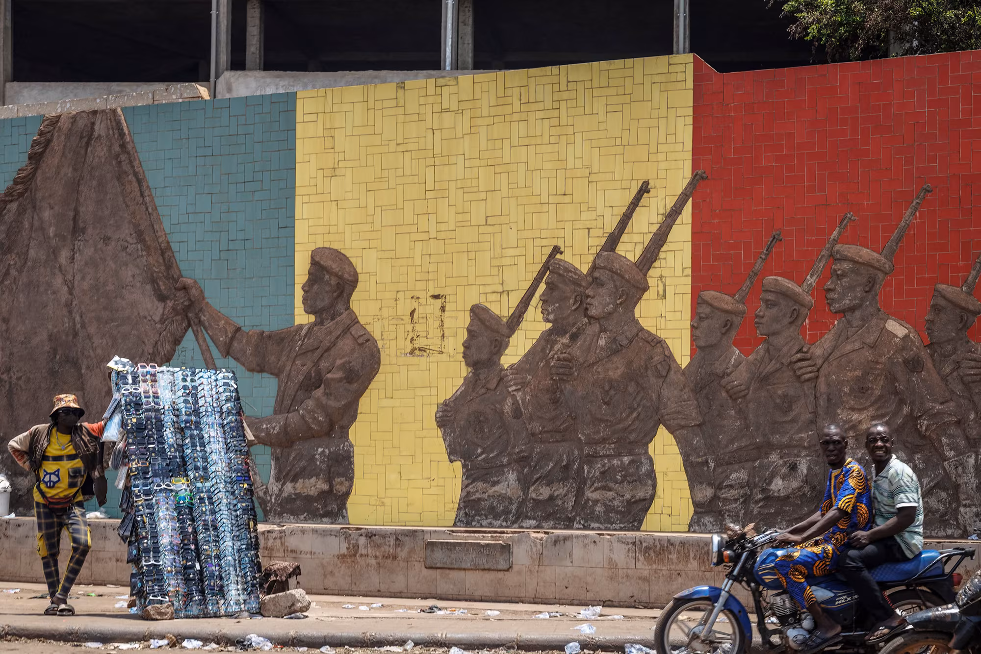 A motorcyclist rides past a monument in support of the Malian army in Bamako.