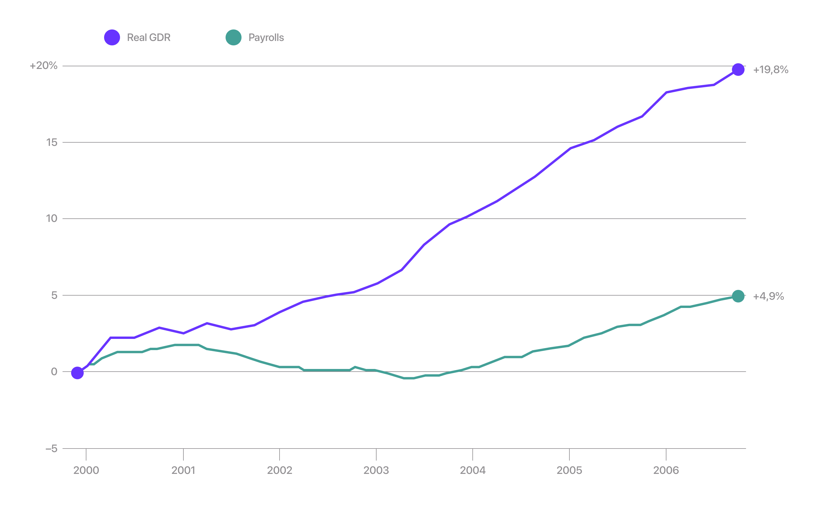 This combination of steady GDP growth and continued job losses reflected a surge in productivity. American companies were finally reaping returns on years of investment in information technology. At the same time, a wave of outsourcing and offshoring—enabled by technological progress and globalisation—allowed firms to expand the production of goods and services while relying on fewer working hours within the United States. High productivity ultimately makes society richer, but it comes with a painful adjustment phase for workers.