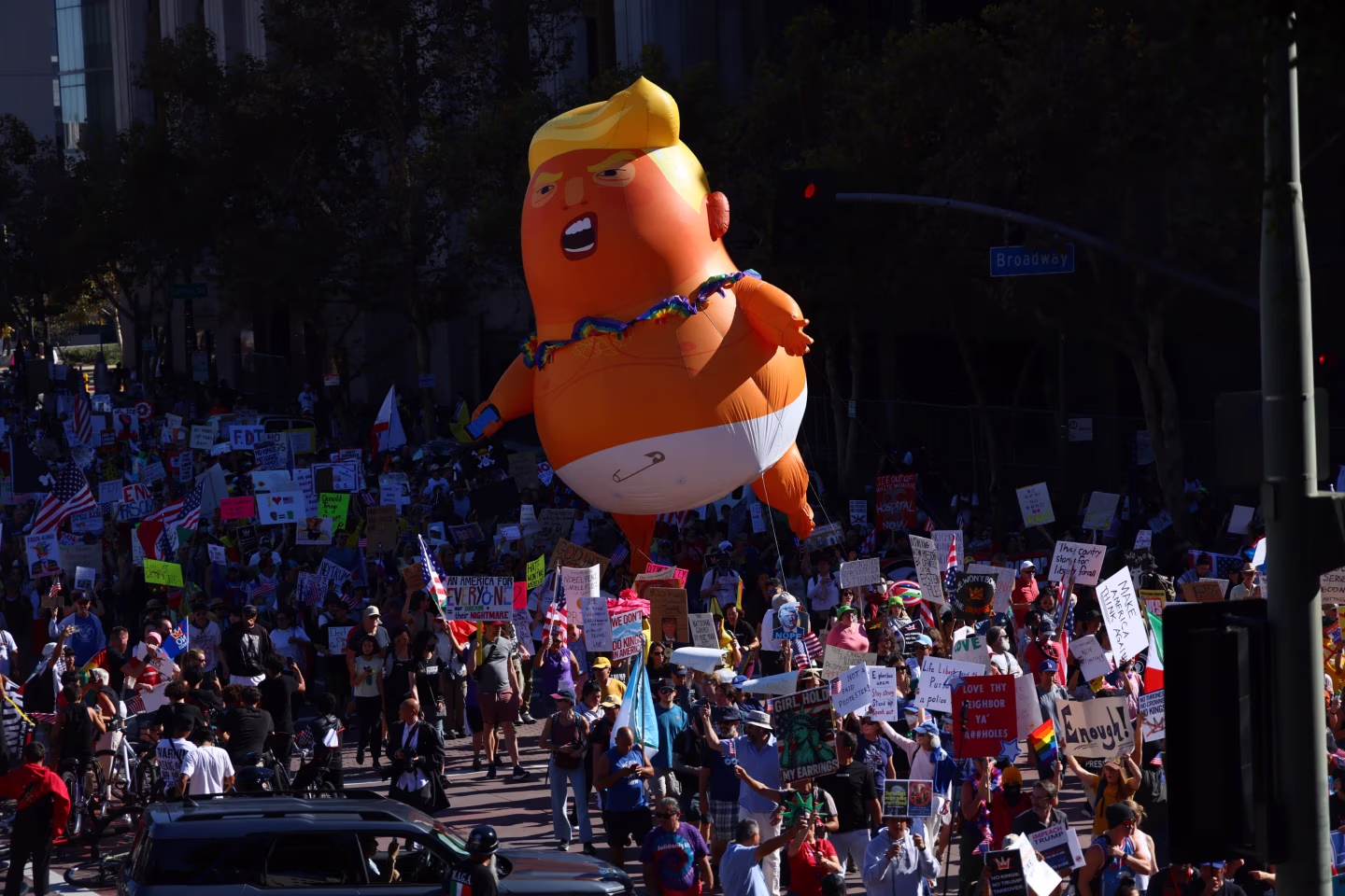 In Los Angeles, 72-year-old Ginny Ashbach was taking part in her forty-second protest since Trump’s inauguration. She attended the No Kings rally dressed as SpongeBob SquarePants—her second choice after failing to find an inflatable frog.