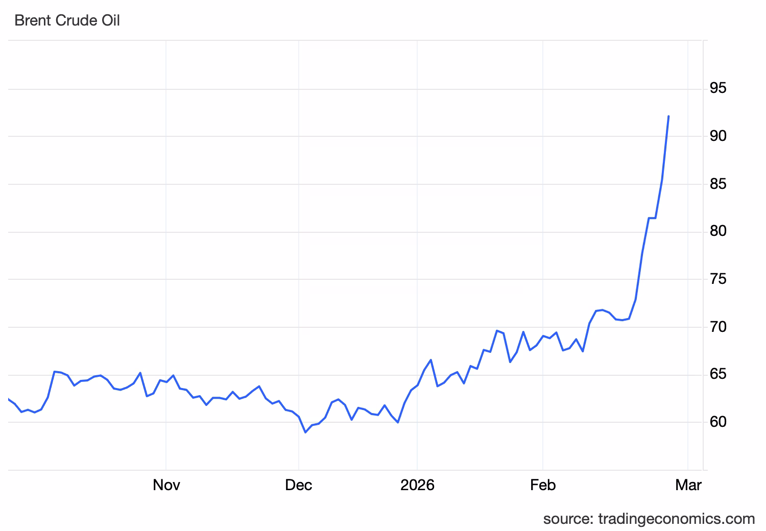 By midday in London, Brent crude had risen nearly 10 percent to $93.59 a barrel. That is the highest level since April 2024 and a sharp increase from $72 before the conflict began. The U.S. benchmark WTI gained more than 13 percent to reach $91.57 a barrel.