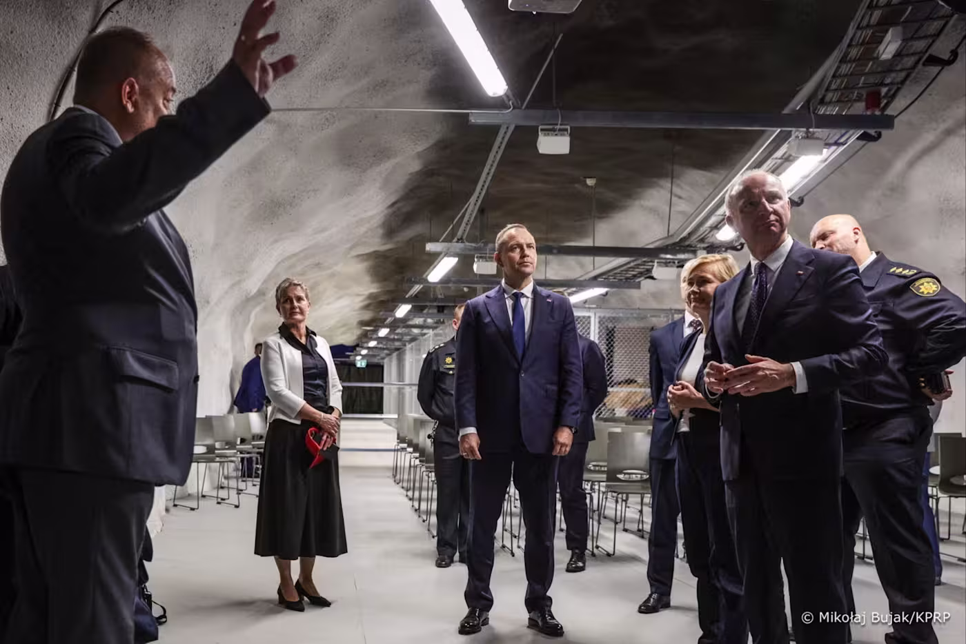 President Karol Nawrocki, center, during a visit to the Merihaka civil-defense shelter in Finland.