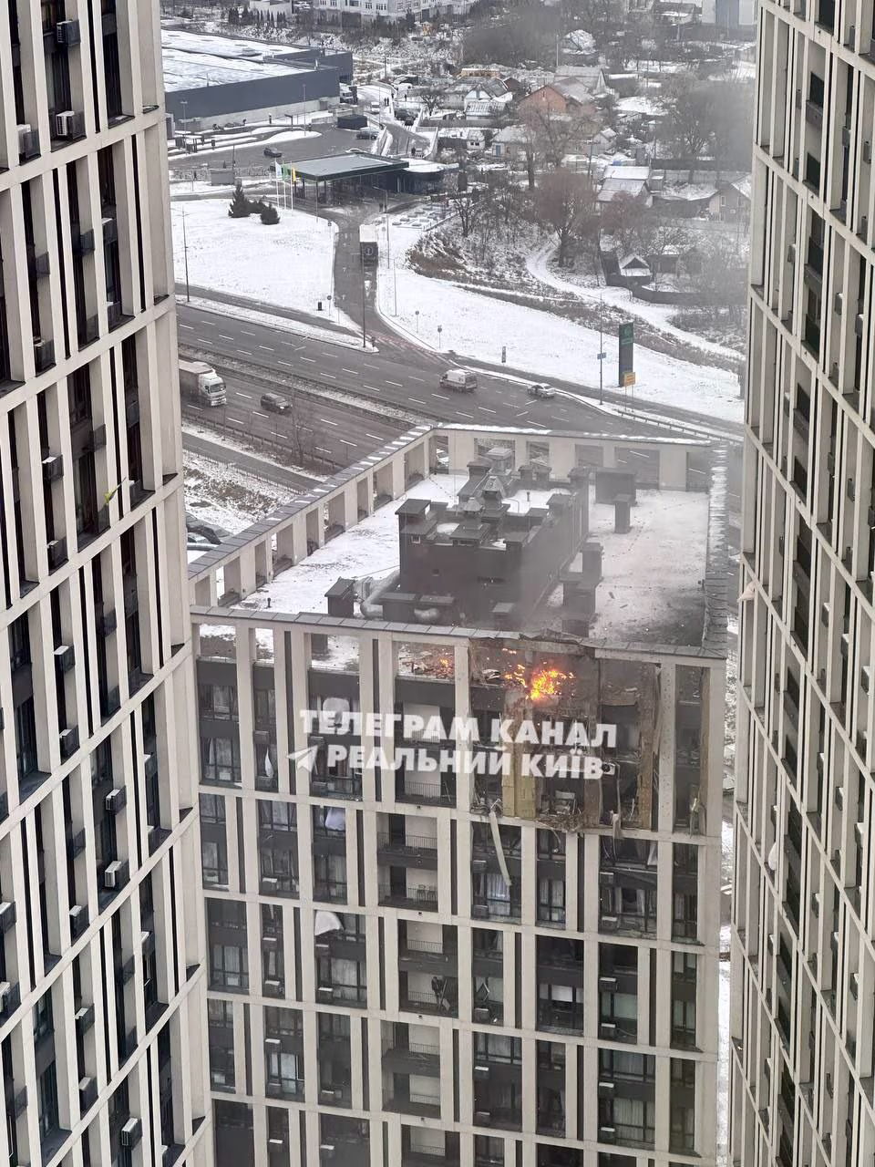 A drone strike on the Slavutych residential complex in Kyiv.