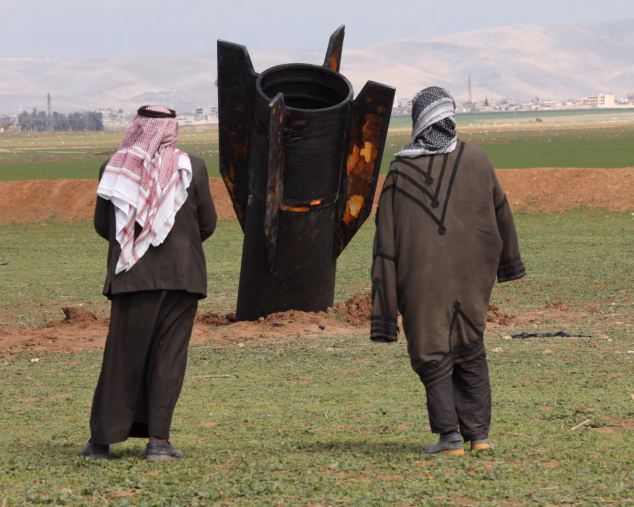 People stand next to an Iranian missile that fell near Qamishli International Airport in Syria.